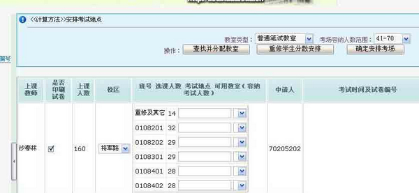 专用教室等),申请人务必先落实考试地点的情况下,自己手工输入考试地点。 5)所有笔试考试课程,请点击“查找并分配教室”,系统自动匹配合适的考场。若对系统自动匹配考场不太满意,申请人可自行选择系统提供的教室。 6)教室后面括号内的数字[如2101(85)]为该教室最大容纳考生人数,若考生人数超过教室最大容纳人数,则考试地点申请不能成功。 7) 对于上课人数太多或重修生需单独安排考试地点的,请点击“重修学生分散安排”,后,再点击“查找并分配原则教室”。 二、各教学单位操作流程、总体要求 1、操作流程 1)进入教务系统―→监考安排―→查看/打印考试安排 2)进入教务系统―→监考安排―→撤销考试申请 2、总体要求 1)委派监考前,核查考试地点是否合理。不合理的情况下,对课程和学生均为本院,教学单位负责人可进行“撤销考试申请”,退回到“考试时间申请”或“考试地点申请”状态。若涉及其它娱乐城注册