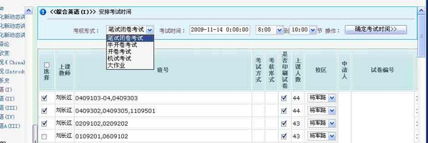 、教学单位: 为促进本科生课程考核组织管理全过程科学化、信息化、规范化建设,结合我校多年考试组织管理的实践经验,教务处新开发了本科生考试管理系统。目前,对于非集中停课课程的考核(即课程结束后的考核),从本学期开始,老师可随时随地自主上网申请组织考核。明故宫、将军路校区的学生及老师均可上网查看课程考核安排。现将任课教师、教学单位、学生的操作流程、总体要求、操作要点说明如下。 一、 任课教师操作流程、总体要求、具体操作要点说明 1、操作流程式: 进入教务系统―→考试时间申请―→考试地点申请―→查看/打印考试安排―→打印送印单及试卷标签 2、总体要求: 1)为确保监考安排、网上发布、试卷送印等后续考务组织工作顺利进行,申请教师务必在课程结束两周前完成本项操作。 2)对于同一门课程具有多位任课教师,需共用一套试卷且同时组织考核,由一位任课教师同时完成考试时间及地点申请操作。 3)完成考试时间和地点申请操作后,任课教师均可查看/打印考试安排信息。 4)考试前一周,申请教师方可打印试卷送印单、试卷标签及考生签到表(带照片)。试卷送印地点遵照以往要求执行,若有变动另行通知。 3、具体操作要点说明 图一 1)“考核形式”为下拉式菜单,申请人可根据课程考核要求,选定相应的考核形式; 2)“是否共用一份试卷”中,“是”或“否”的选择说明: 申请人进入系统时,默认情况为“否”。 “否”选择项说明:凡同一门课程(课程号相同)的一位或多位任课教师,需在同一时间组织考试,且共用一套考卷,即可委托其中一位任课教师完成考试时间及地点申请。 “是”选择项说明:只有在如下示例情况下,才选择“是”选项:例如“张三”老师已成功申请考试时间及地点,“李四”老师事后得知,并想同时且共用“张三”老师的考卷,请选择“是”。此项操作必须使用“张三”老师的教务帐号完成“李四”老师所有班级的考试申请,从而确保系统提供同一个试卷编号,老师提交一套考卷。 3)选择考核形式为“大作业”的课程,完成图一操作即可。 4)申请人可根据图二窗口,再次确认“考核形式”、“考试时间”,若有误还可修改。 5) 在图二窗口的“选择”列中,选择参加考试班级。最后点击“确定考试时间”按扭,完成课程考试时间的申请。 图三 4)需用特殊地点组织考试的(如机房、舞蹈房、各娱乐城注册