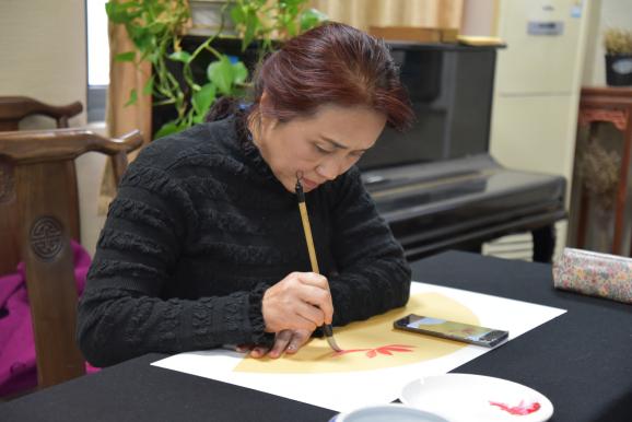在国画创作上,郭洪豹说:“莲与廉同音,蕴含着‘出淤泥而不染,濯清涟而不妖’的高尚精神。”他从色彩的搭配谈到下笔的轻重,从虚实的表现讲到神韵的体现,手把手教在场教师画莲花,不一会儿工夫,一朵朵娇艳的莲花便盛开在了每一位老师的纸上。