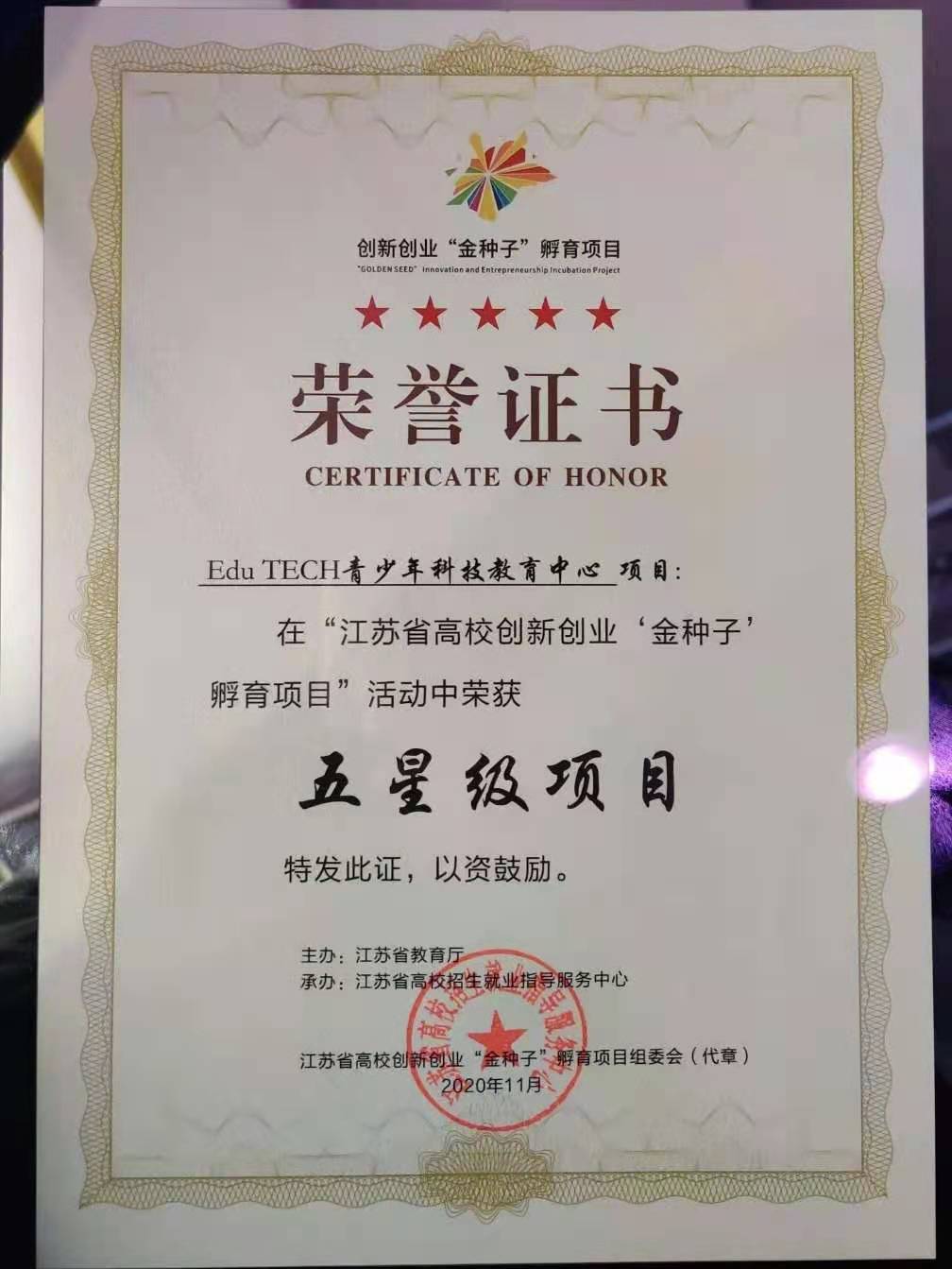 11月28日,由江苏省教育厅主办,省高校招生就业指导服务中心、扬州大学承办的全省高校创新创业“金种子”孵育项目颁奖仪式在常州举行。线上娱乐城注册 “Edu TECH青少年科技教育中心”创业项目获评五星级项目,并被授予“金种子”称号。