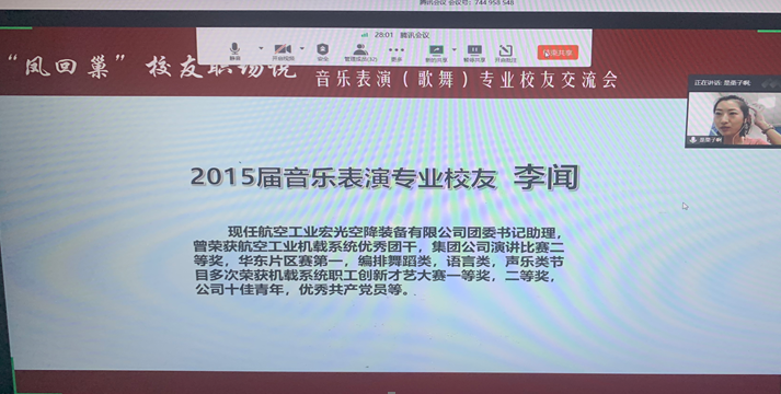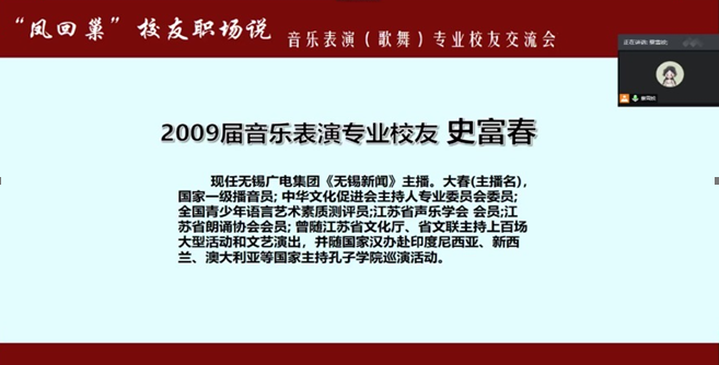 2020年7月23日,音乐表演(歌舞)专场的校友交流分享会如期在线上举行。本次会议由辅导员蔡雪姣主持,有幸邀请到了史富春、李闻、陈彦均三位优秀校友就毕业后面临的就业问题给同学们作了精彩的交流分享。另外,17级音乐表演(歌舞)专业班主任邱爱金老师,线上娱乐城注册 党委副书记王宇宁老师参与本次会议莅临指导,同学们向各位老师的到来表示由衷的感谢。