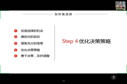 沈雪萍老师就“创造选择机会”、“确定你的目标”、“搜集充分信息”、“优化决策策略”、“用于决策,及时调整”六个方面展开详细指导。