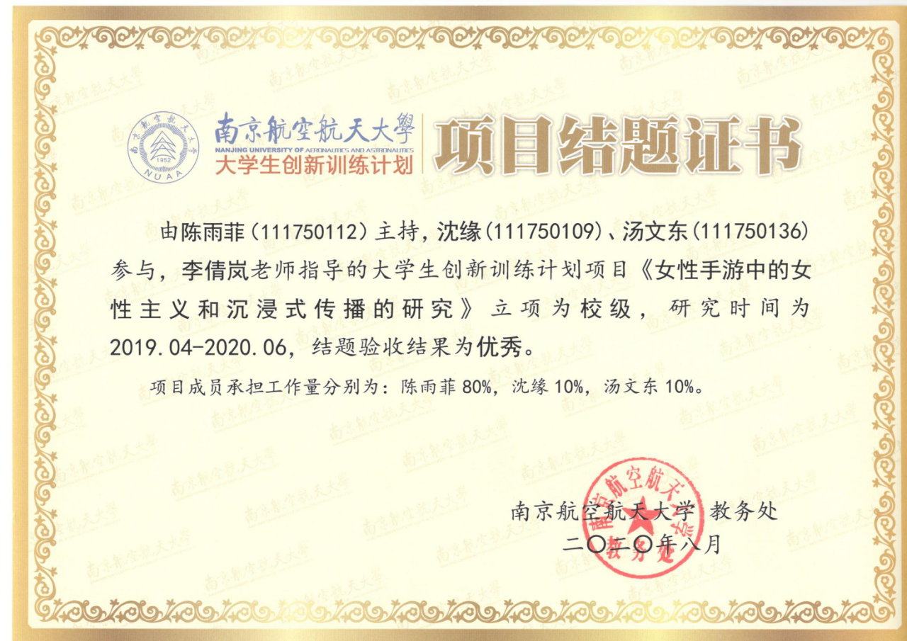 2017年入学至今,我一共38门课90分以上,13门课95分以上,在2018-2019学年,我以综合绩点4.3,必修绩点4.4取得了专业第一的好成绩。本科阶段潜心学术,共有46门课程取得了90 分以上的成绩,最高得分至97分,综合排名位列专业第二,获得过包括一等学业奖学金在内的六项奖学金。/我以第一负责人主持的项目“女性手游中的女性主义和沉浸式传播的研究”获得校级优秀项目。除此之外,还多次作为小组成员参与自由探索项目和创新创业项目,研究成果在国家级传媒刊物《中国有线电视》、省级刊物《今传媒》均有发表。