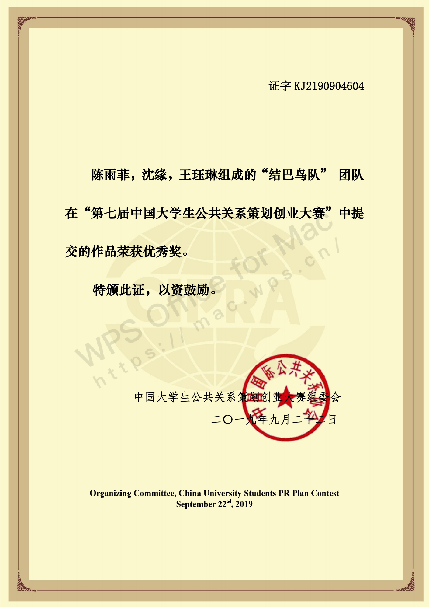 2019年带领团队参加第七届中国大学生公共关系策划创业大赛,为品牌制作公关策划案,从全国上千只队伍中脱颖而出,最终获得国家级优秀奖。