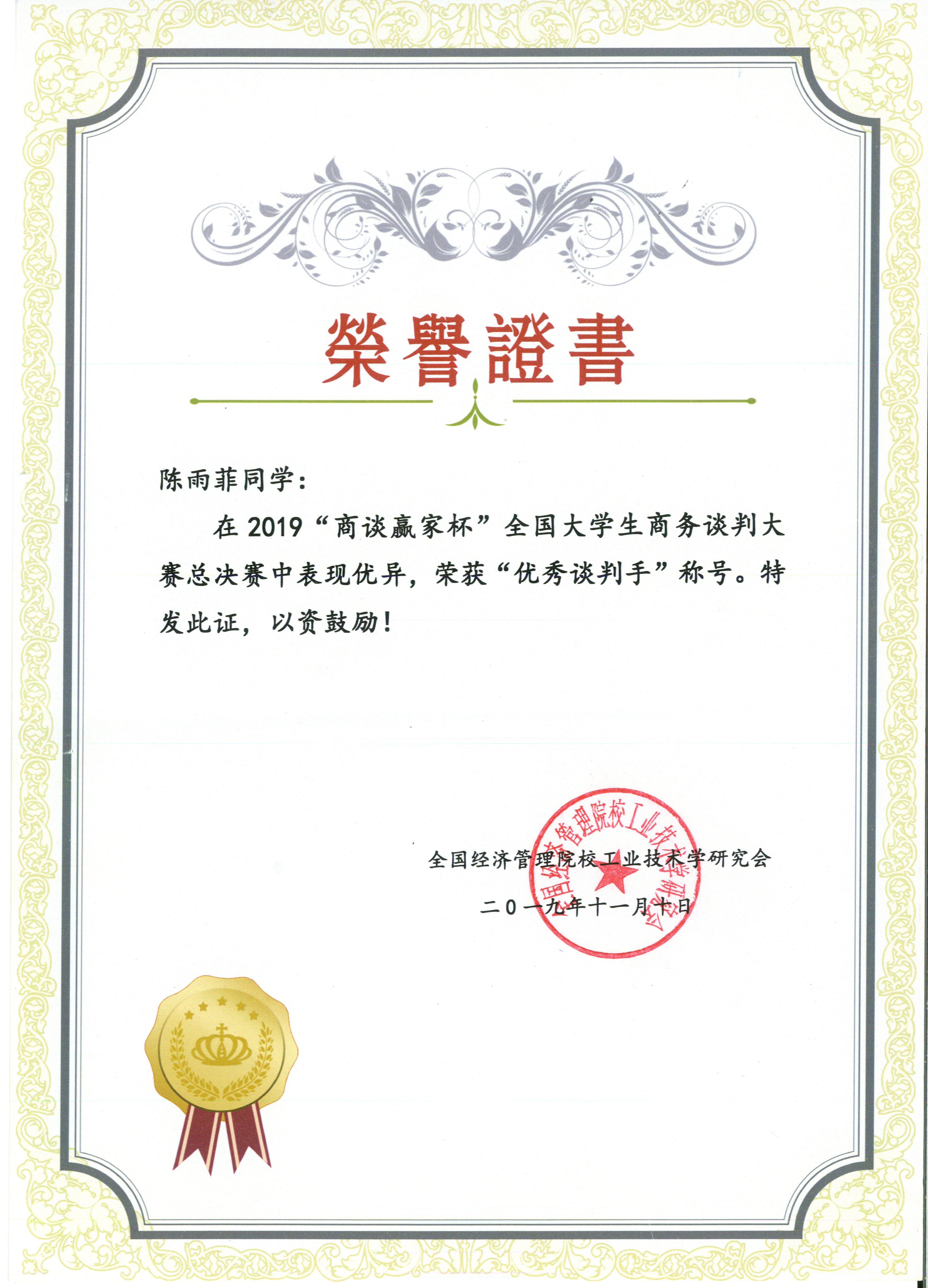 在2019年“商谈赢家杯”全国大学生商务谈判大赛中,我担任南航代表队总队长,并带领自己担任主谈的团队获得特等奖全国总冠军,个人也获得“优秀谈判手”荣誉称号。我在比赛中,合理安排队内分工,掌握比赛节奏,在两场积分赛、两场淘汰赛中获得多位评委老师投票推荐优秀谈判手。在比赛准备前期,我多次协助老师组织沙盘推演,与队内的同学分享参赛经验。