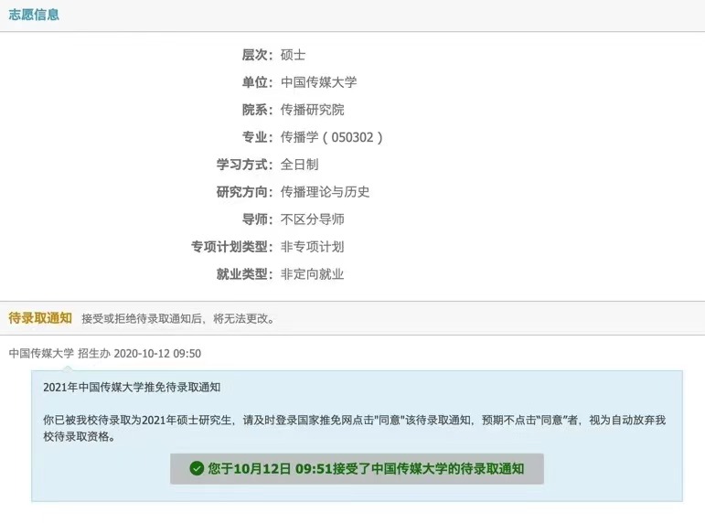 通过过去三年的努力,我顺利取得了推荐免试研究生资格,并拿到浙江大学、中国传媒大学传播研究院、暨南大学的录取通知。