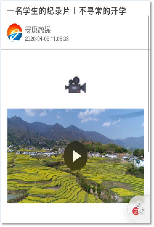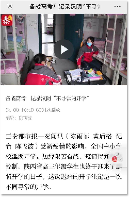 疫情期间,在确保安全的前提下,我深入基层,担任编导、摄像、剪辑工作,完成纪录片《不寻常的开学》,以贫困家庭的高三学子为主人公,我希望通过这个人物以小见大的反应出特殊时代背景下中国人民众志成城抗击疫情的品质,该纪录片被推广在学习强国平台,秦闻等多家省市级媒体也参与报道。