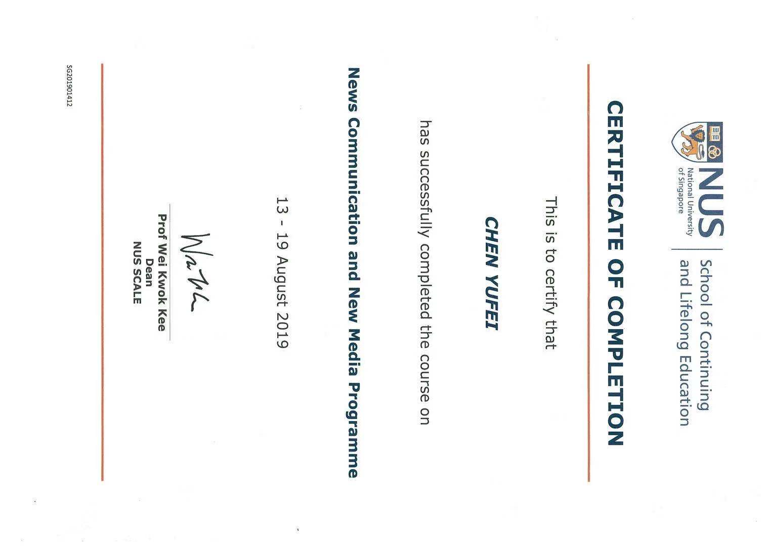 在2019年暑假我受邀参加了新加坡国立大学“新闻传播与新媒体”的暑期访学项目,访学期间,多次参与无领导小组讨论、为广告公司制作纯英文策划案、最终我顺利拿到优秀结业生证书。