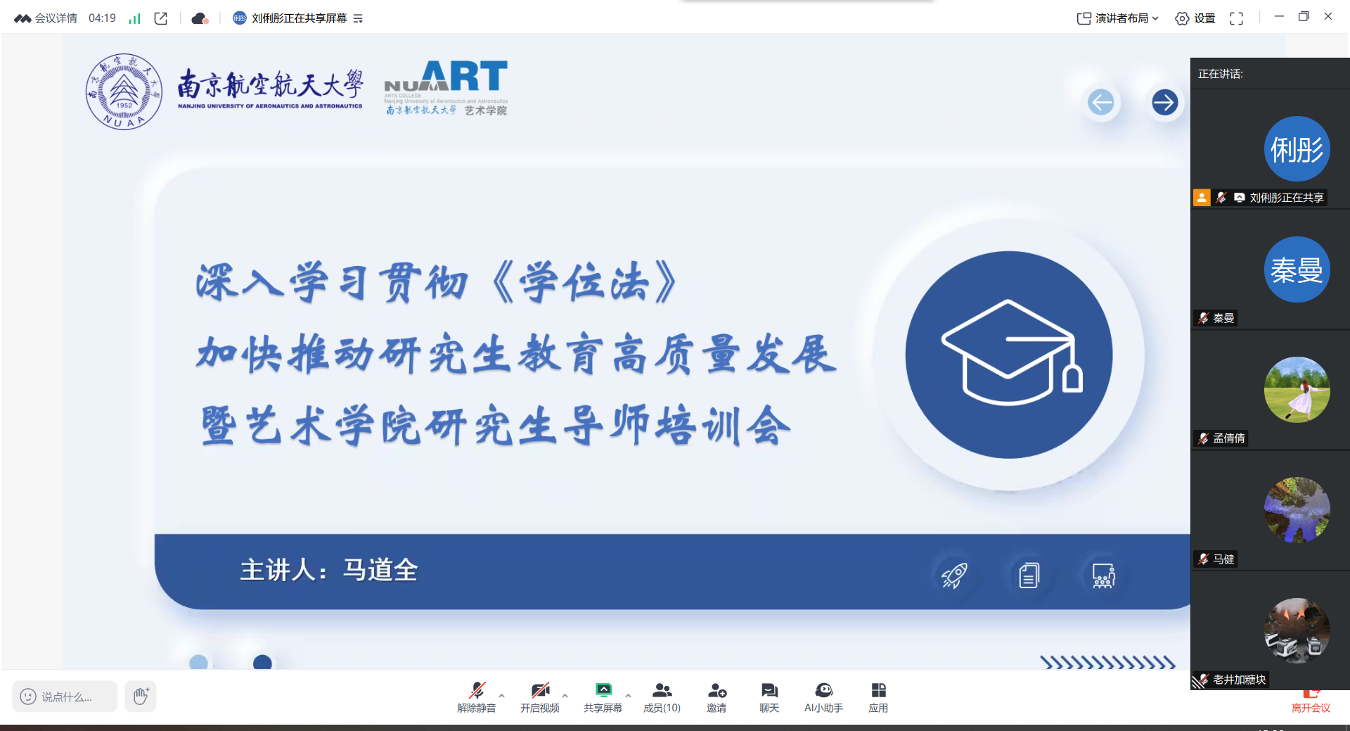 培训会上,马道全系统而深入地解读了研究生院近期根据《学位法》要求发布及修订的一系列学位相关文件,如《学位评定委员会章程》、《硕士学位论文、实践成果评阅及答辩工作程序》、《学位授予工作细则》等,着重剖析了新旧政策的变化与衔接,详细阐述了新规在学位申请成果展现、学位论文答辩程序、学位评定委员会决议、论文质量指导与保障等关键环节的新要求、新标准。特别是针对学位授予标准的进一步明确、答辩程序的优化与完善、学术复核通道的建立与畅通、学术不端行为的预防与处理等导师们普遍关注的重点问题,结合实际案例进行了清晰说明和操作指导。会议介绍了近些年学校在学位与研究生教育改革的重点举措和在招生选拔、学业考核、导师队伍、科研训练等方面的相关政策,聚焦关键,凝聚共识,明确了导师是研究生教育质量的生命线,须成为新规的深入学习者、坚定执行者和积极传播者。